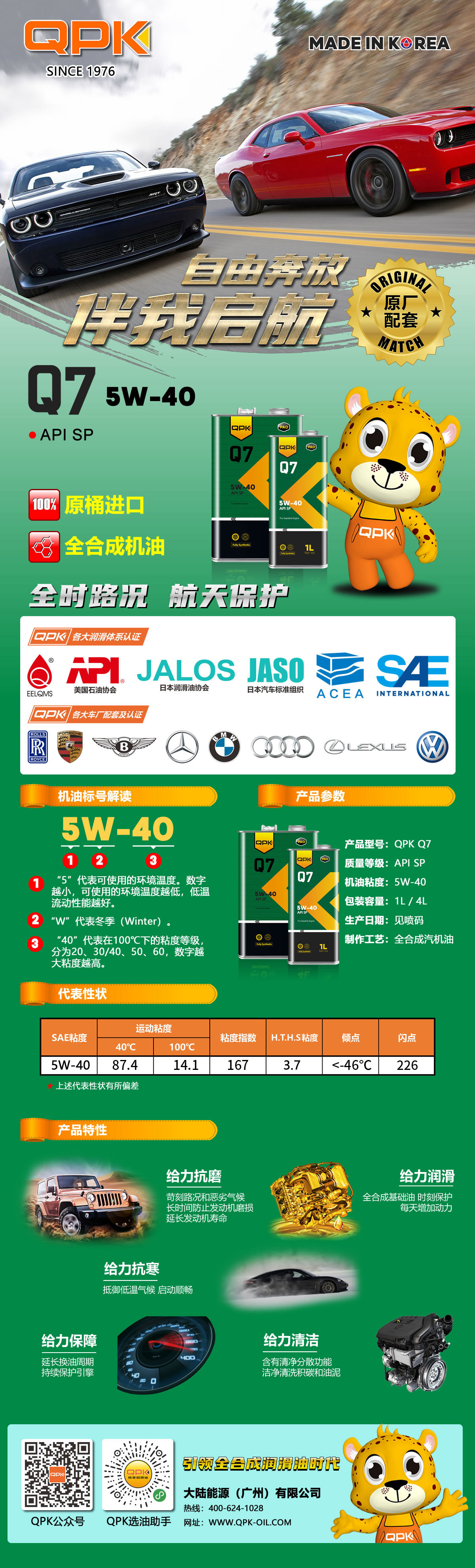 QPK Q7 5W-40配合了最新清洁分散剂,可有效去除发动机内部灰尘和沉淀物